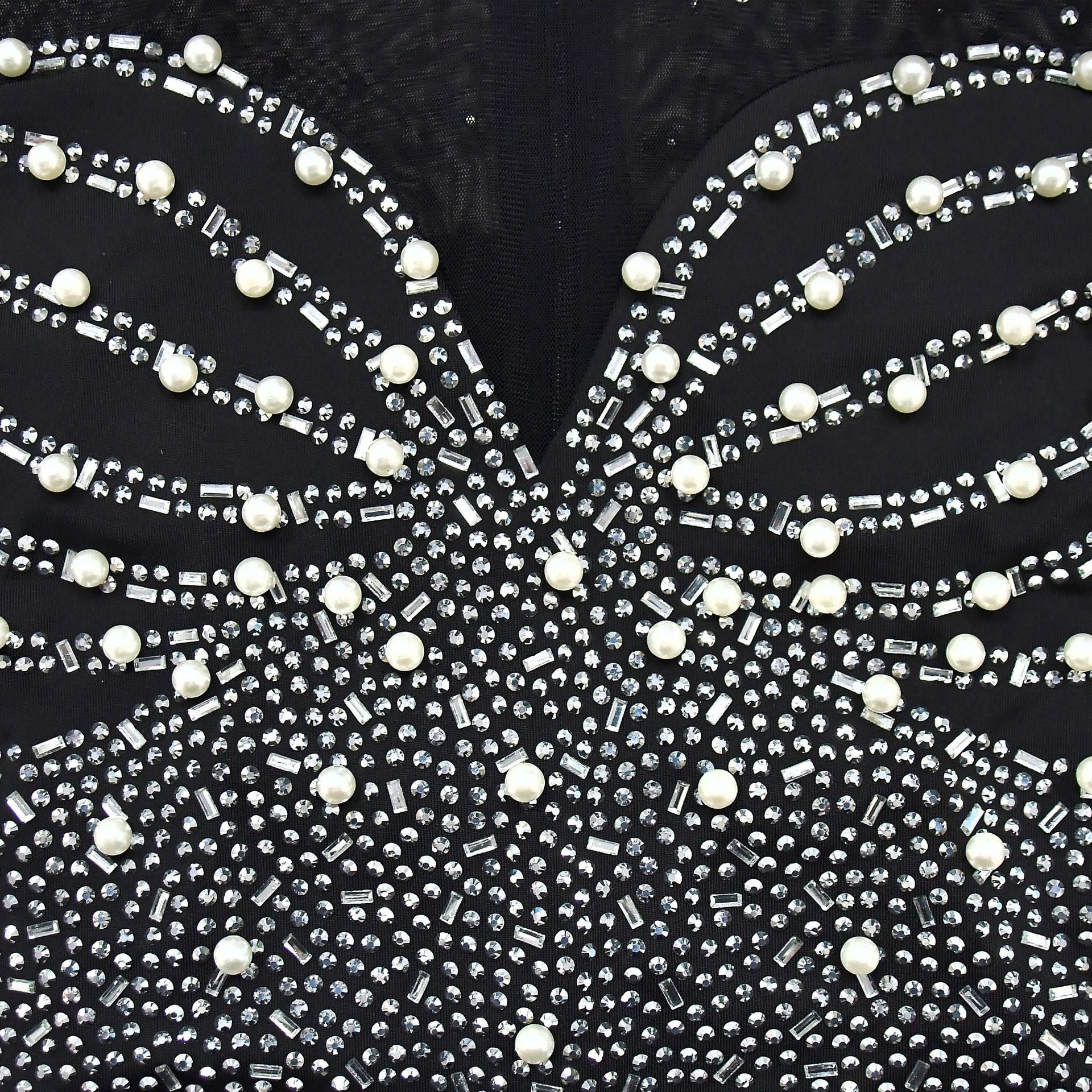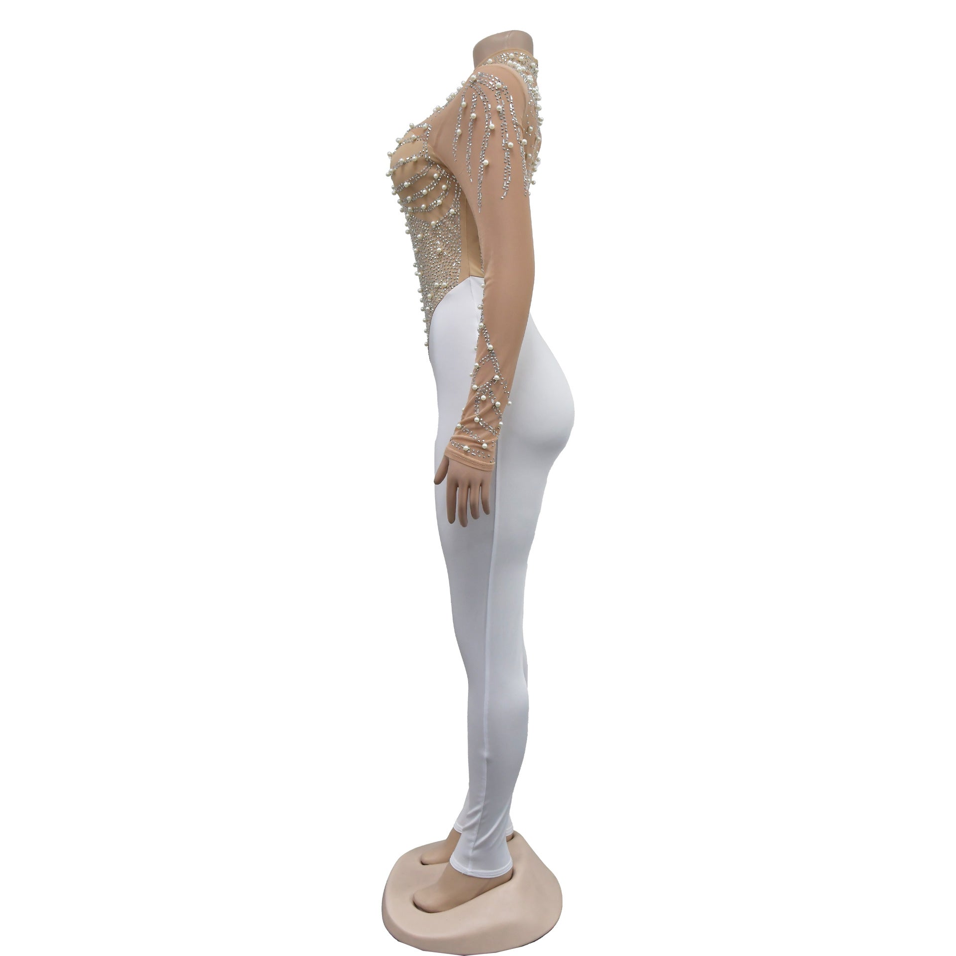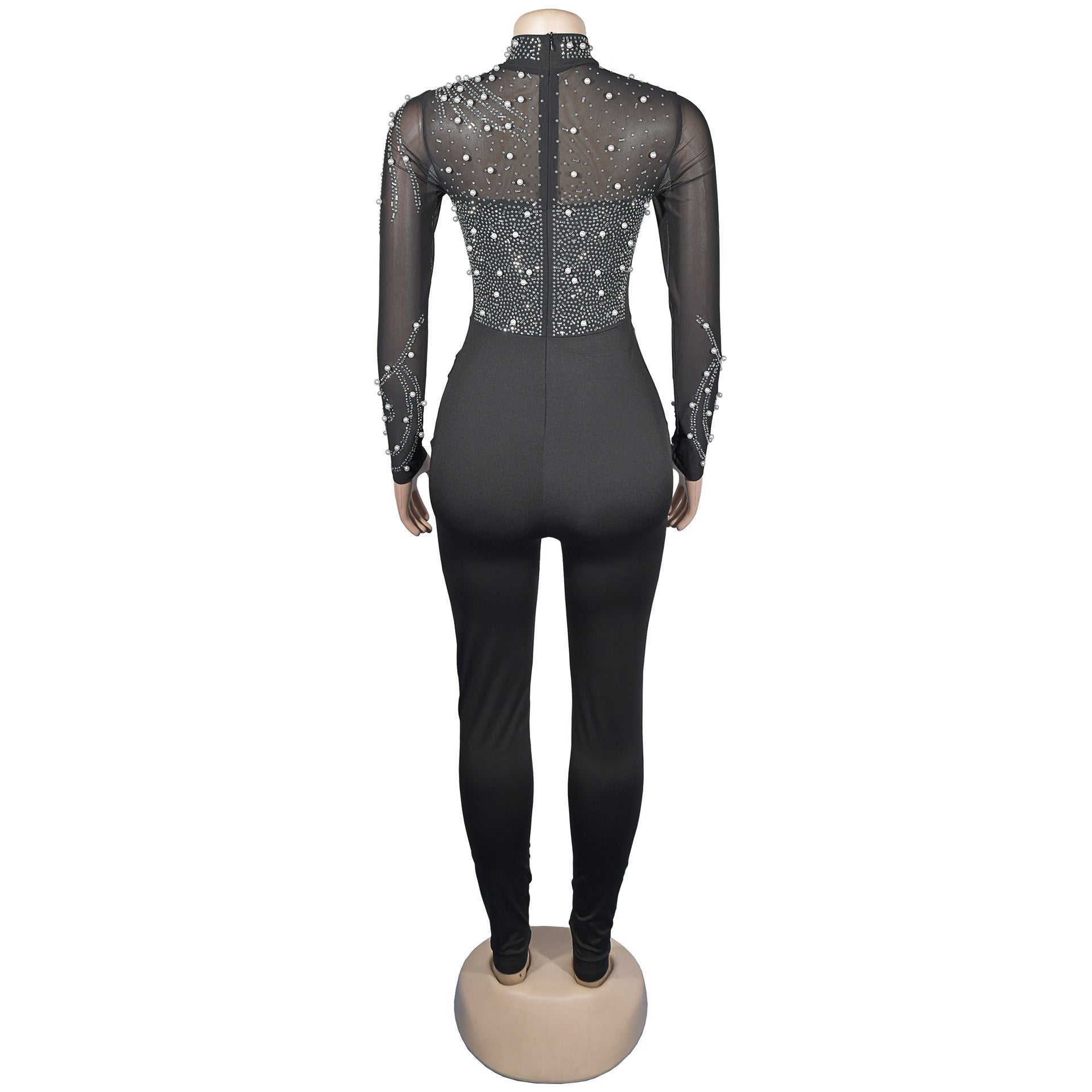 European and American Fashion Women's Solid Color Mesh Rhinestone Long Sleeve Long Pants Jumpsuit